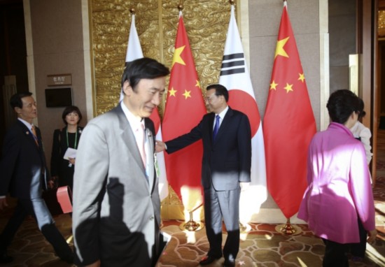 李克強(qiáng)總理會見韓國總統(tǒng)樸槿惠時(shí)對方提出,韓方愿同中方等各方加強(qiáng)溝通協(xié)調(diào),爭取新一輪韓中日領(lǐng)導(dǎo)人會議早日舉行。李克強(qiáng)說:"希望在重大問題上,日方能與中方、韓方相向而行。"