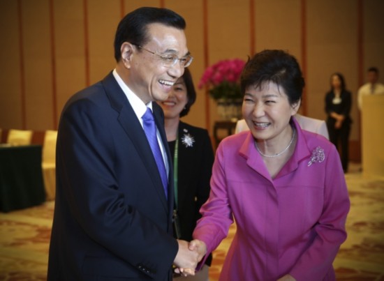 韓國總統(tǒng)樸槿惠對李克強(qiáng)總理表示:"韓中日三國合作有利于地區(qū)和平穩(wěn)定。要引導(dǎo)日本抱著正確的歷史觀,為東北亞和平做出貢獻(xiàn)。"